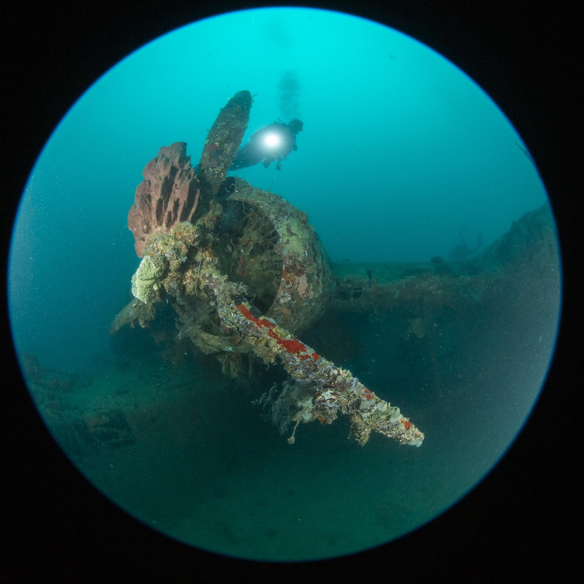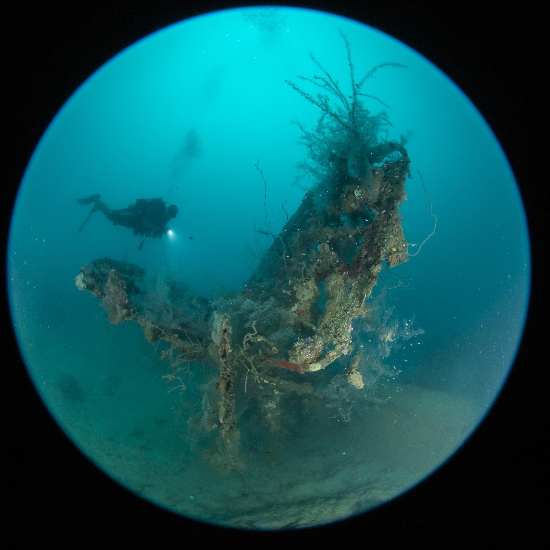 A person is swimming in the water near an underwater shipwreck.
